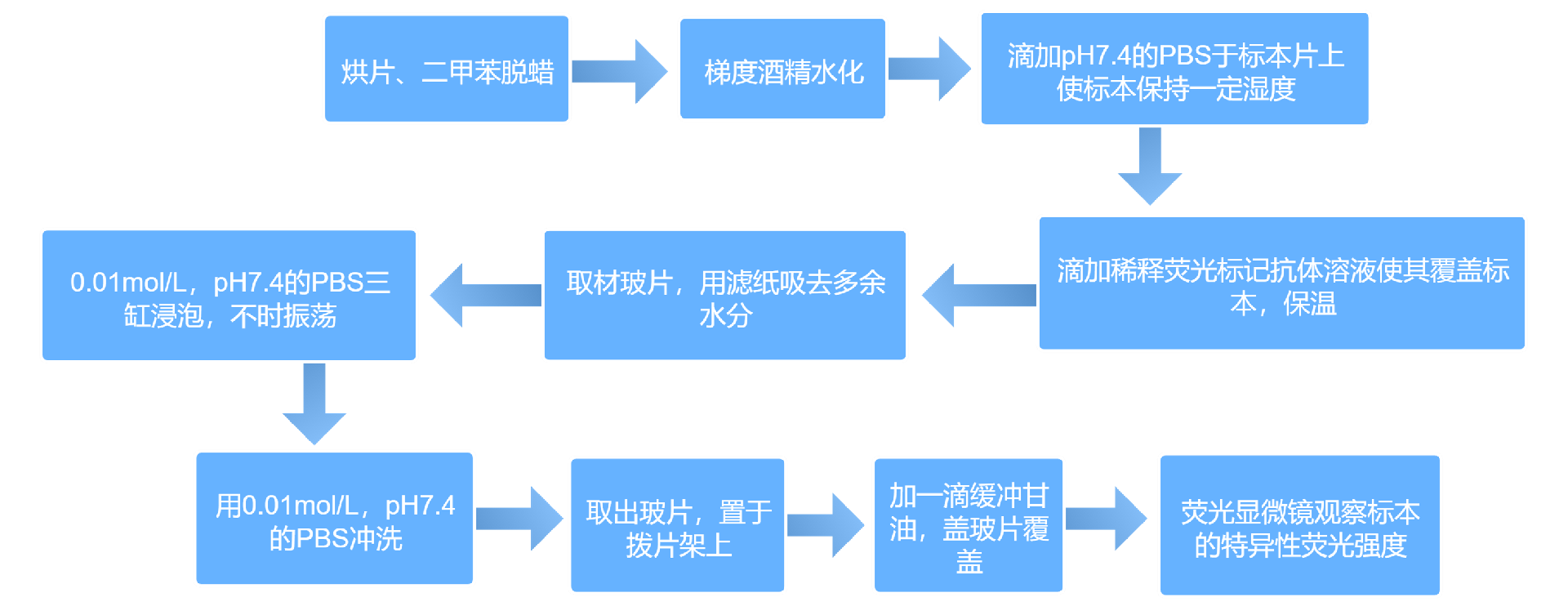 该技术的主要特点是:特异性强、敏感性高、速度快。主要缺点是:非特异性染色问题尚未完全解决,结果判定的客观性不足,技术程序也还比较复杂。