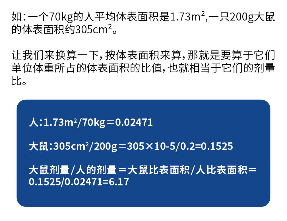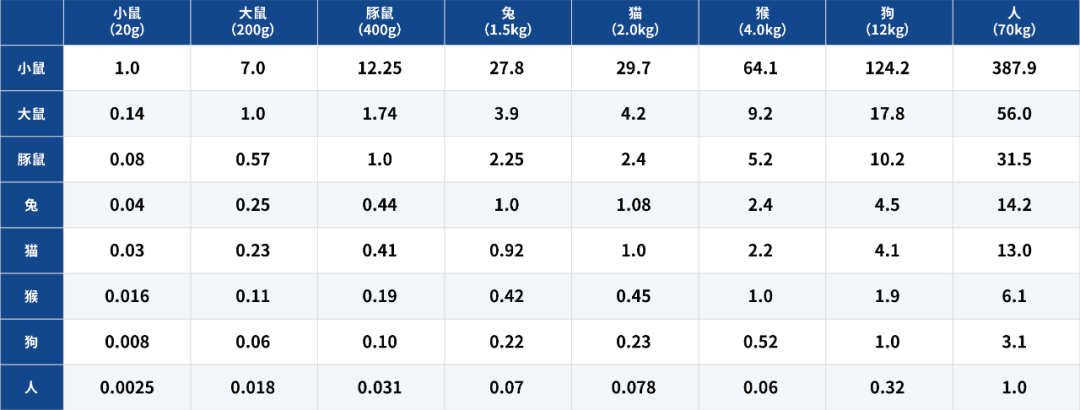 依此类推,我们可以算出小鼠、豚鼠等其它动物剂量与人的比值。