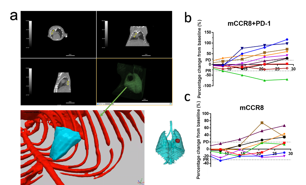FVB老龄鼠自发肺癌抗体药物药效评价。 (a) FVB老年鼠自发肺癌结节示意图,分别展示了横断面、冠状面、矢状面以及三种不同渲染方式的3D重建图像(绿色:肺部,红色:骨骼,蓝色:肿瘤,来自软件“simpleware”,蓝色肺部和红色肿瘤)。(b,c) 单臂试验下,靶向药物治疗后结节抓取绘制3D重建图像,其体积的变化量统计图。(n=每组10/8)