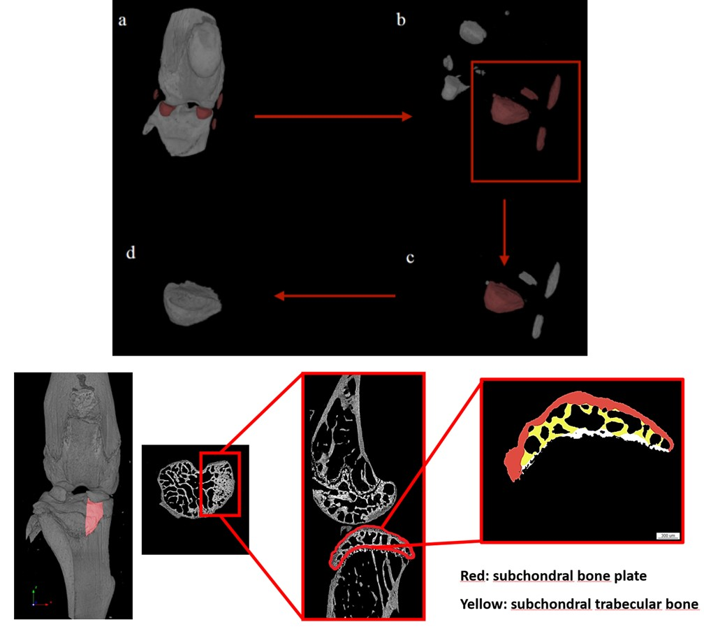 骨性关节炎模型造模手段通常有交叉韧带横断术(ACLT)和内侧半月板扰动(DMM)二者的评判标准和分析角度几乎一致,如胫、股骨软骨下松骨的结构性参数以及胫骨平面的厚度和孔隙度等,如果更关注软骨还可以进行离体组织造影来分析软骨。