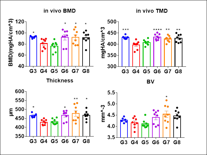 靶向抗体药物治疗药效良好。假手术组(G3),手术组(G4),药物溶剂组(G5),药物浓度递增组(G6-G8),数据显示为平均值±SEM,并使用单因素ANOVA进行分析与G4进行比较,“in vivo BMD”与G5进行比较。